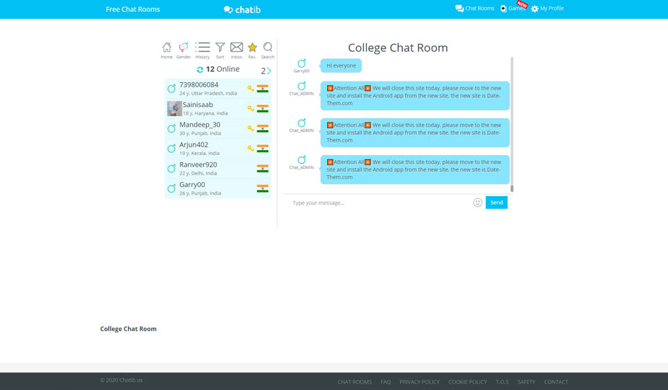 Přestože Chatib ještě není tak populární jako jeho oponenti, existuje mnoho aktivních uživatelů. Chat určený pro velké věkové publikum od 10 do 60 let. Nejčastěji existují profily účastníků ve věku od 18 do 35 let. Vzhledem k tomu, že chat nemají v úmyslu pouze pro randění a flirtování, ale také pro komunikaci na různá témata, můžete ve skupinovém chatu diskutovat o všem, od náboženství, etiky, sportu, hudby. Chatib vítá muže a dívky jakékoli orientace, páry, které hledají páry, gaye a lesbičky. Chatib je bezplatný web pro setkání a komunikaci s různými lidmi. Každý den tato komunita přitahuje stále více svěžích tváří, s nimiž je vždy o čem mluvit, a mnozí dokonce najdou své zápasy s Chatibem.