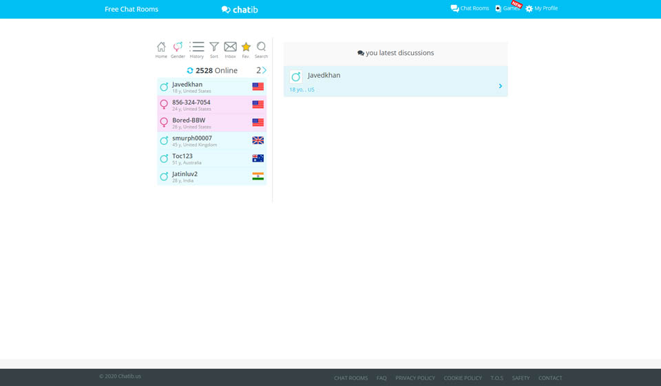 Chatib je bezplatný online chat. Pomocí této aplikace se bez registrace můžete bavit s náhodnými cizími lidmi, najít příjemného konverzátora nebo dokonce partnera. Chatib, stejně jako většina seznamovacích aplikací, nabízí svým uživatelům vyhledávání singlů pomocí vyhledávacích filtrů. V Chatibu najdete záložku hledání, kde můžete vybrat filtry vyhledávání ve vyskakovacím okně. Seřadit cizince, které vás zajímají, podle pohlaví, země narození a věku. Toto jsou bohužel všechny filtry, které aplikace poskytuje. K dispozici je také karta s uživateli online, kde můžete také procházet profily a volitelně odesílat zprávy a skupinové chaty.