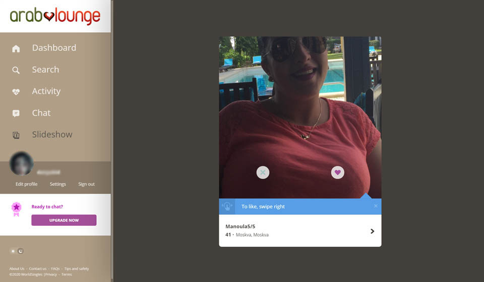 Además, hay una función de búsqueda con todas las configuraciones necesarias como una opción para ver usuarios en línea o para verificar los nuevos miembros y, por supuesto, para hacer su búsqueda más específica ingresando algunos requisitos específicos como edad o distancia. Desafortunadamente, ArabLounge actualmente no tiene una aplicación móvil. Sin embargo, una versión móvil personalizada facilita el acceso a todas las funciones necesarias y la búsqueda de solteros atractivos sobre la marcha.